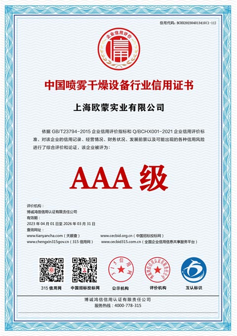 上海歐蒙實業(yè)有限公司坐落于中國“申城魔都” “東方巴黎”----上海。是一家集產(chǎn)品研發(fā)、設(shè)計、制造、營銷于一體的綜合企業(yè)。為客戶提供整體解決方案。 上海歐蒙****產(chǎn)品主要有:噴霧干燥機系列、實驗室噴霧干燥設(shè)備、干法制粒機、噴霧造粒機、沸騰制粒機、噴霧干燥制粒機、濕法混合制粒機、旋轉(zhuǎn)制粒機、單錐真空混合干燥機、雙錐回轉(zhuǎn)真空干燥機、混合機系列、蒸發(fā)蒸餾、濃縮提取系列等。